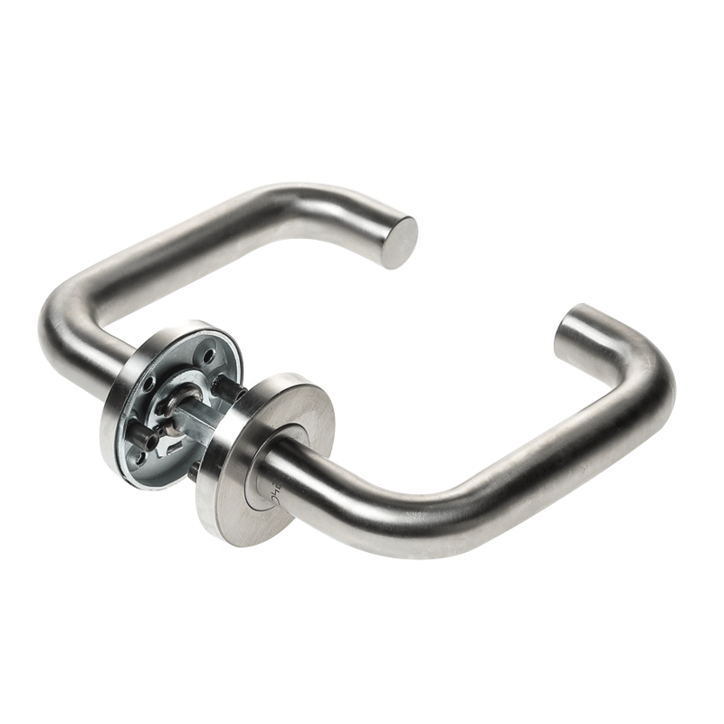 d4E Doorlever pair fixed/rotatable suspended on rose I U-design I doorthickness 37-65mm I CE (NEN-EN 1906: 2010 Grade 4) I stainless steel304, brushed I L/R [Din 1,2,3,4] I incl. mounting kit d4E Architectural Doorlever pair on Rose with spring support I U-design I doorthickness 37-65mm I CE (NEN-EN 1906: 2010 Grade 4) I SS304, brushed I L/R [Din 1,2,3,4] I incl. fixing kit Design4Excellence, always be improving The d4E stainless steel lever handle pair on rose is available as standard in the mostly used L, L90°, U and C design. An almost infinite design range is available on request in tube, hollow and solid castings. The stainless steel is manufactured to a high quality and beautifully brushed finish. Our range of Stainless Steel Lever Pair on Rosette is CE certified to NEN-EN 1906: 2010 in Grade 3 and 4. The product range has the following characteristics: - Grade 3 is carried out with extra thick tube material, brass core and steel foot, and is therefore suitable for high / intensive use. - Grade 4 is carried out with extra thick tube material or castings, stainless steel core and steel foot provided with lugs. This even higher grade is specially suited for heavy / very heavily used doors with an increased risk of abuse for public buildings and general doors in apartment complexes. - L, L90°, U and C design standard models (other models and designs on rose and shield on request) - Standard available in stainless steel 304 (stainless steel 316 on request)